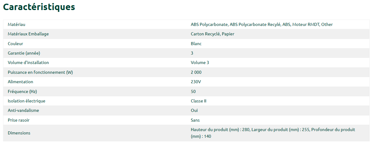 Sèche-Cheveux pour piscine Dragon à air chaud, équipé d'un moteur à induction et résistant en atmosphère chlorée. Silencieux avec seulement 70 dB.